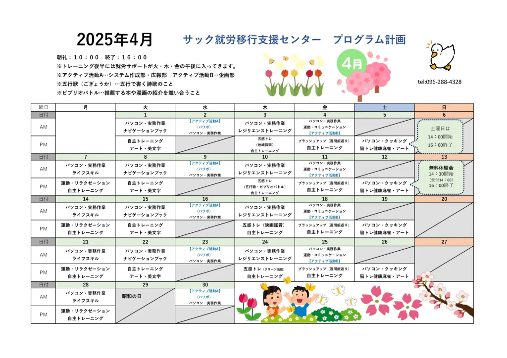 サックの4月の月間予定をお知らせします📣
