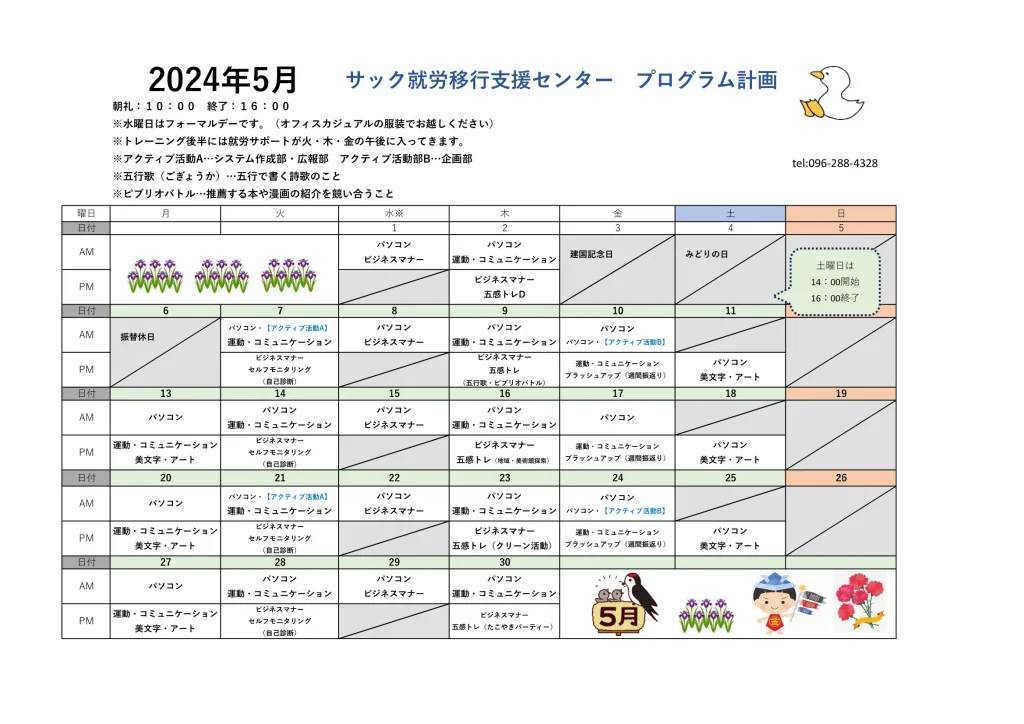 サックの5月の月間予定表をお知らせします📣