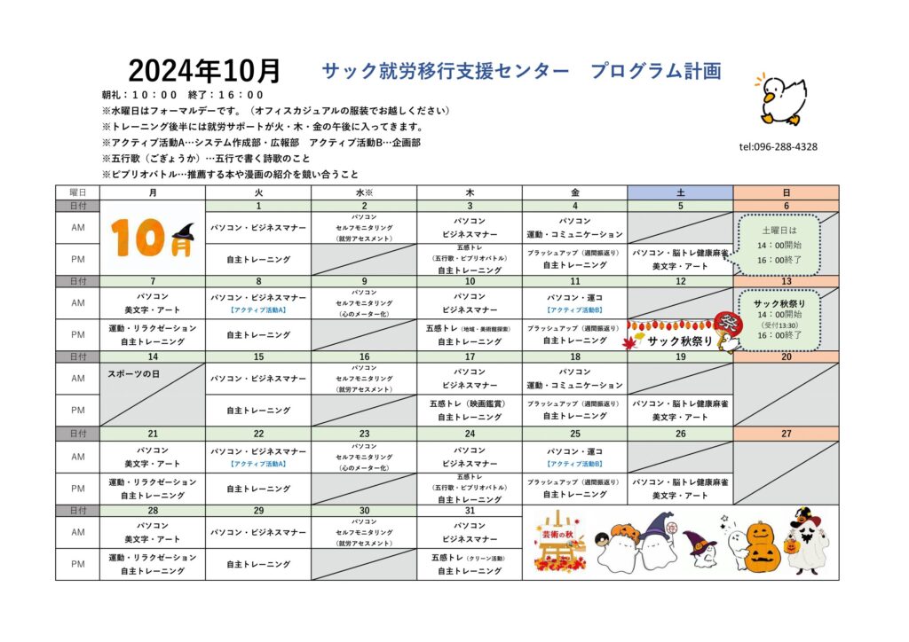 10月の月間予定表をお知らせします📣