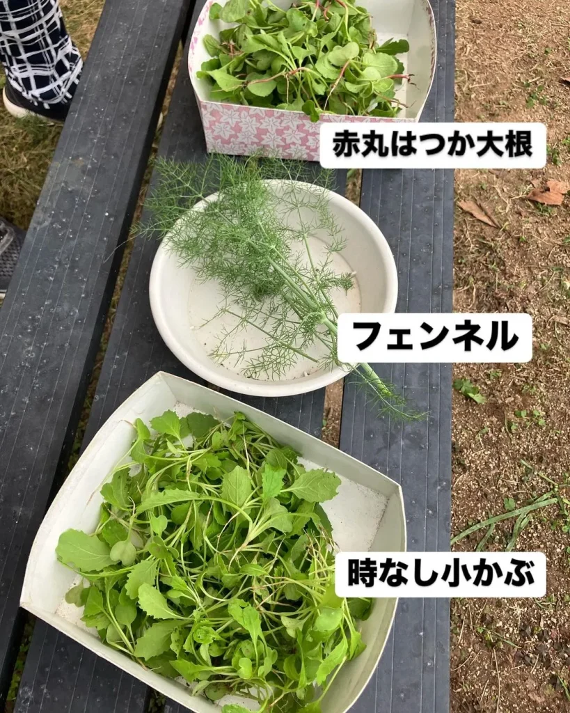 間引きした、はつか大根や子かぶの葉っぱ、利用者さんが以前持ってきてくださったフェンネルです✨