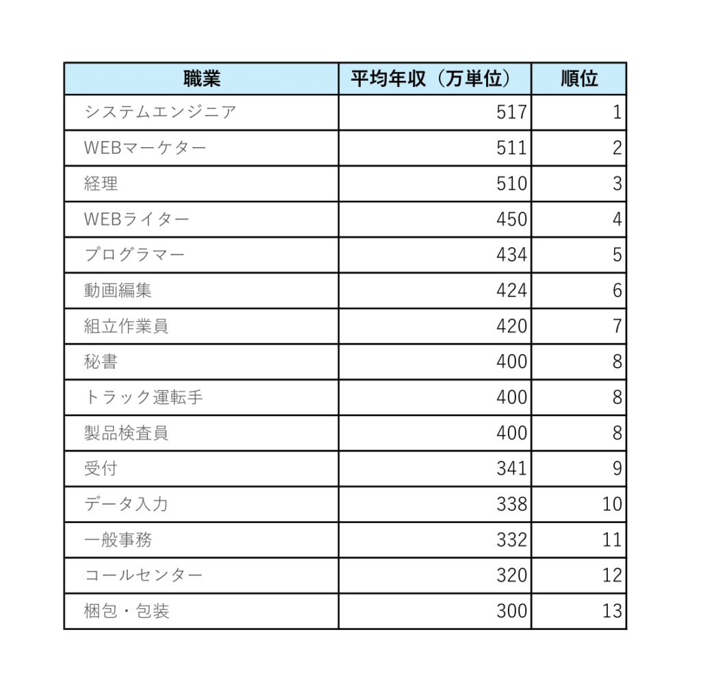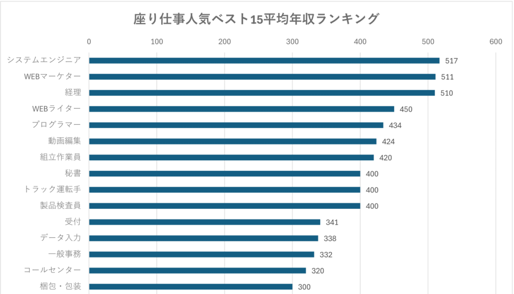 座り仕事人気ベスト15 平均年収ランキング