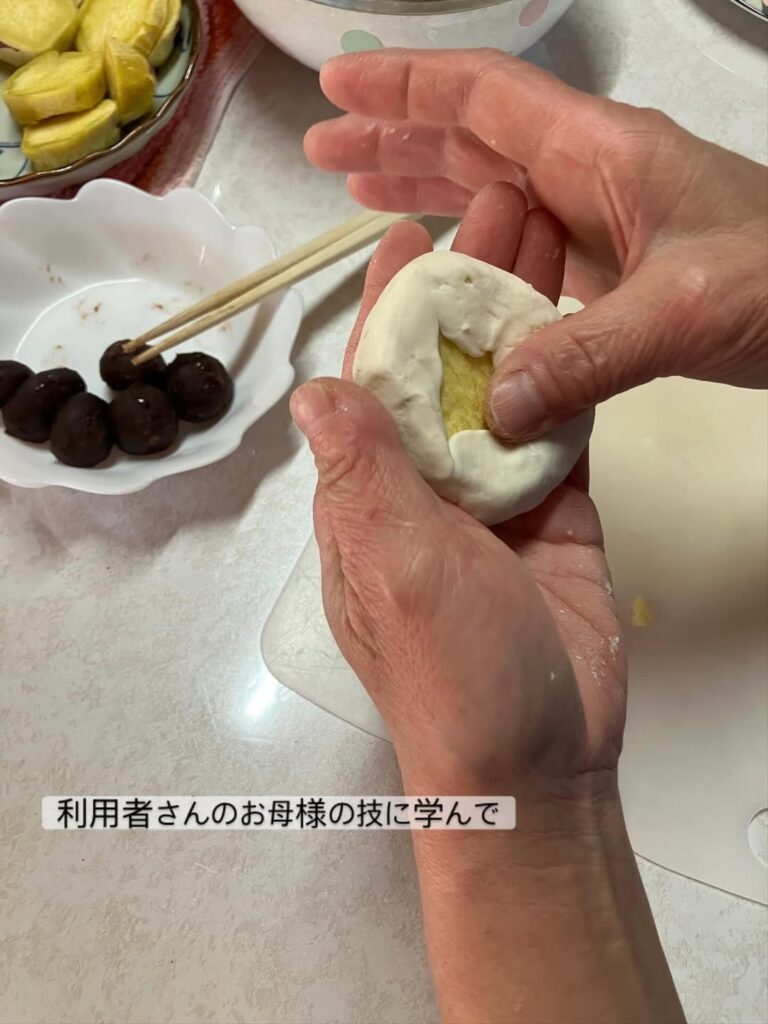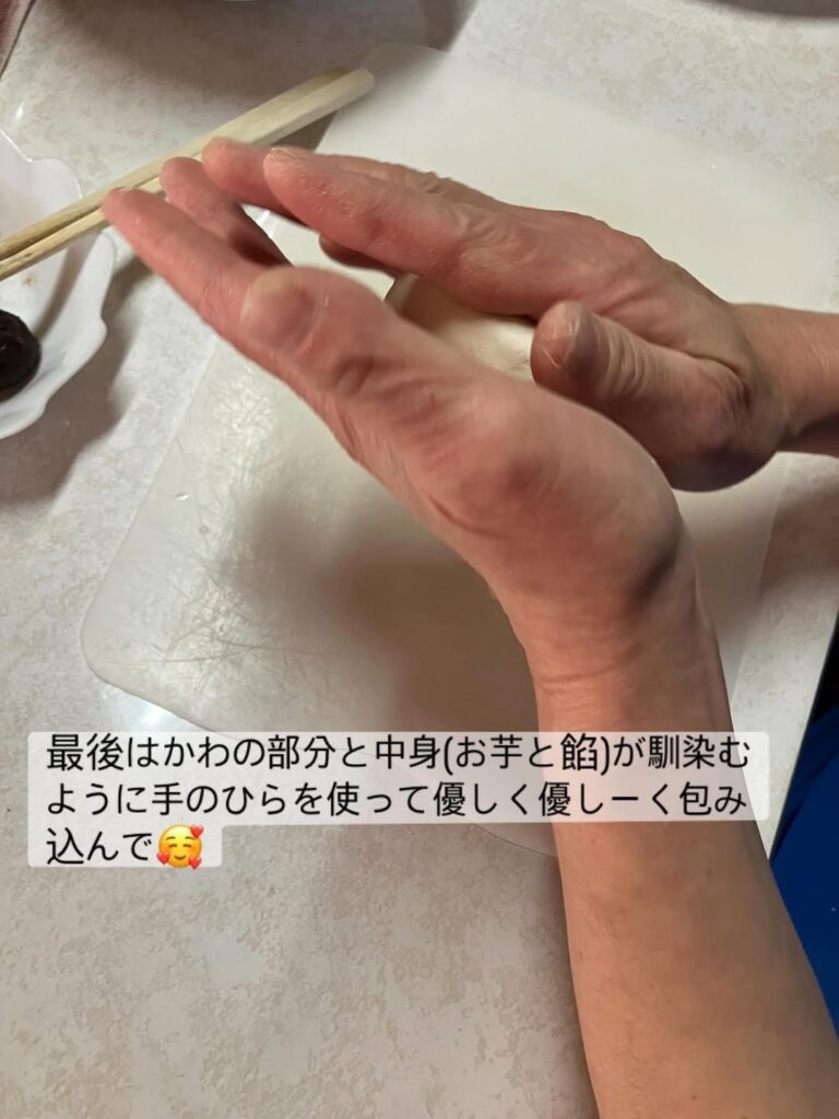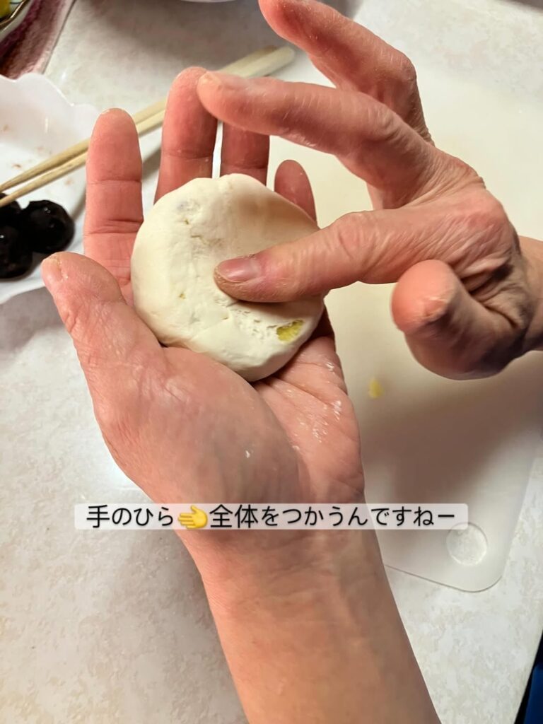 ⚪︎生地は指先で伸ばさず、手のひらで包み込みながら下から少しずつ伸ばしていく。