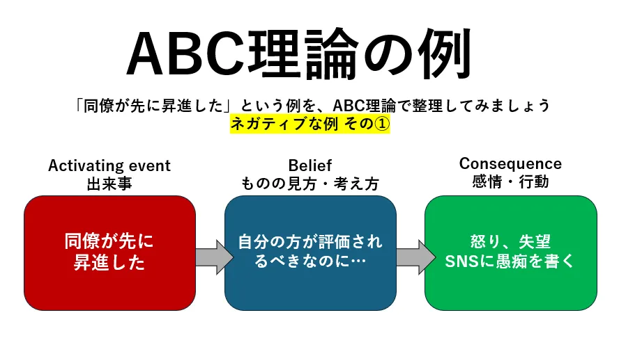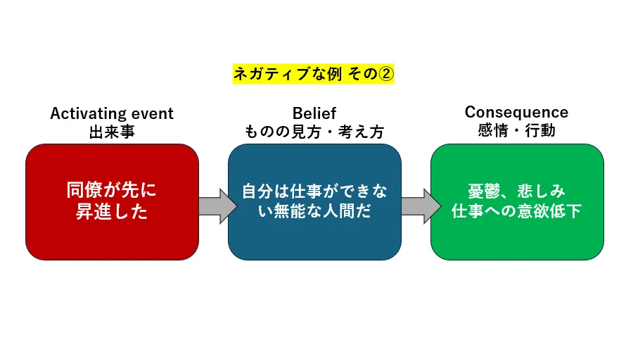 この例では、「自分の方が評価されるべき」というものの見方・考え方があるからこそ、昇進という出来事に強い怒りや失望を感じていることが分かります。